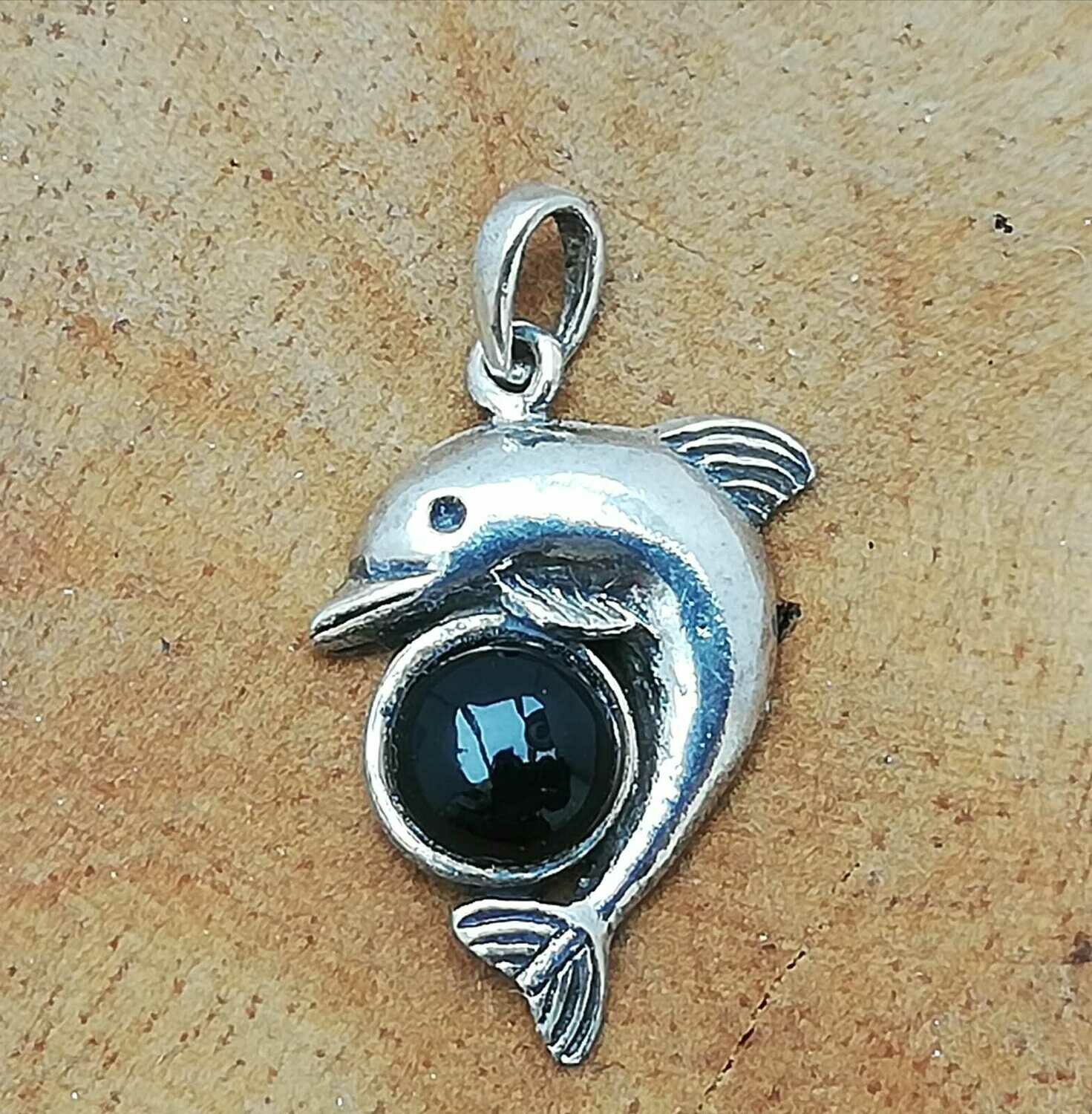Delfin mit Onyx, Echt Silber 925 Anhänger