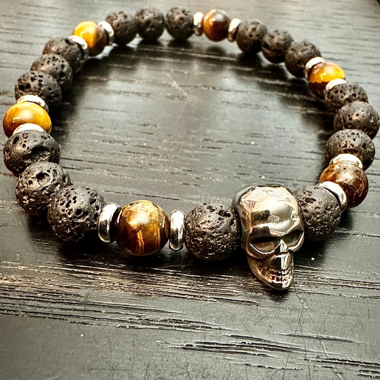 Totenkopf-Armband aus Lavastein, Tigerauge und Edelstahl Beads